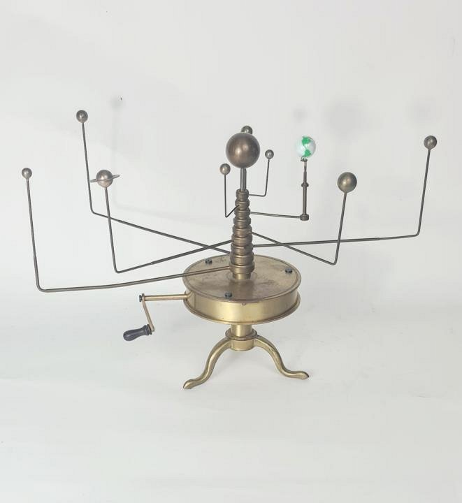 Brass antique style planetarium/Orrery providing a mechanical model of the earth in relation to the planets in the solar system.