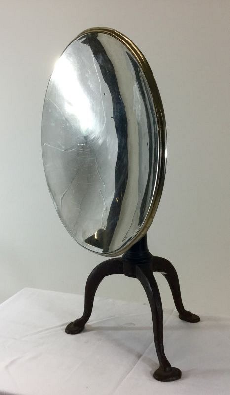 Period parabolic reflector on a cast iron three legged stand. A parabolic reflector is used in physics demonstrations to concentrate or focus energy waves such as light, sound or heat. This example stands 66 cm tall with a dish diameter of 43 cm.