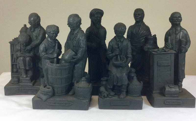 A set of Victorian figurines depicting Galen of Pergamum, Avicenna and various branches of medicine and apothecary.